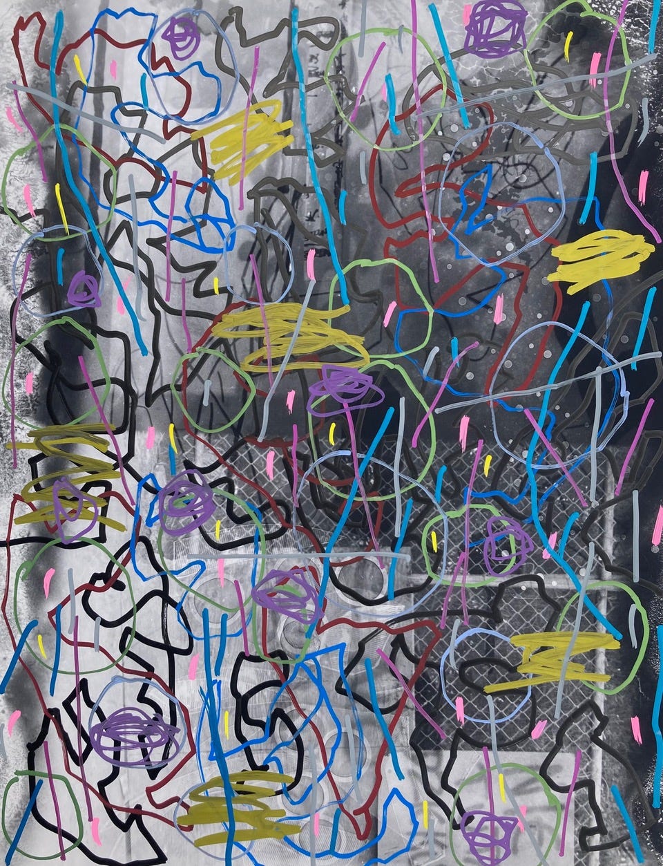 The series, Disorderly Conduct, is made with ink on silver gelatin prints. Each print is unique. They were created in the Todd Watts darkroom while on residency in Monson, ME., and finished in my Upstate NY studio. They are inspired by the last paintings of Dubuffet and my grandson’s energetic drawings.